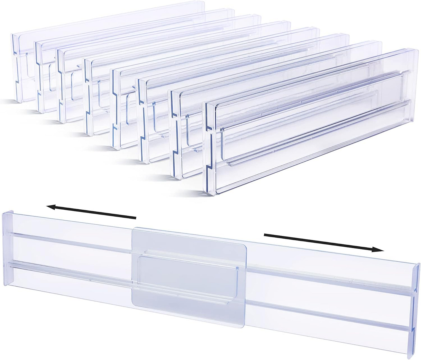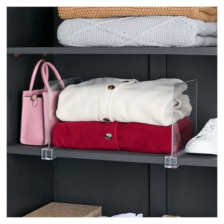 These clear dividers keep my closet organized while maintaining visibility. I use them to contain stacked sweaters and bedsheets on an eye-level shelf.